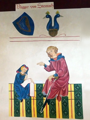 This is Bligger von Steinach, as depicted in the Codex Manesse, the beautifully illustrated songbook of German courtly songs in the middle ages. He was a noble who resided in Neckarsteinach in the 13th century but his fame came from his Minnelieder, his songs of courtly love. If the picture holds true he dictated his works to a clerk rather than stain his own fingers. I took the photo at the Starkenburg above Heppenheim which is today a youth hostel and pictures of the Manesse Handschrift decorate the hallways.