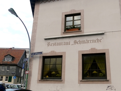 The inn Schmärrnche in Frankfurt Bornheim has a similiar long history to look back on. The windows are not particulary elaborate either but at least they tried with the trompe l’oeil sandstone frames.