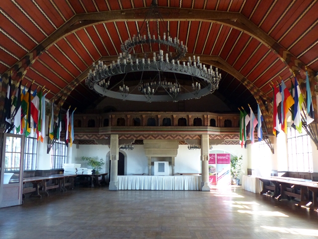 This is the chapter house of the Wachenburg in Weinheim, a room where large meetings are held. Normally one finds such halls in church related buildings such as monastries or cathedrals but this chapter house is part of a castle built by an association of fraternities. It is used once a year by the association itself when the fraternity members have their annual meeting, the rest of the year it can be booked for events.