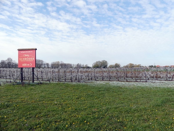 This is another photo of the cold morning after the cold night we had last week, threatening the new blooms on the espaliered trees in the orchard. The clouds are, I think, cirrocumulus floccus (meaning “look of wool”).