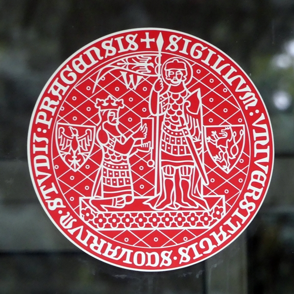 The seal of the university of Prague, featuring Karel IV, King of Bohemia, and Wenceslaus, patron saint of Bohemia.