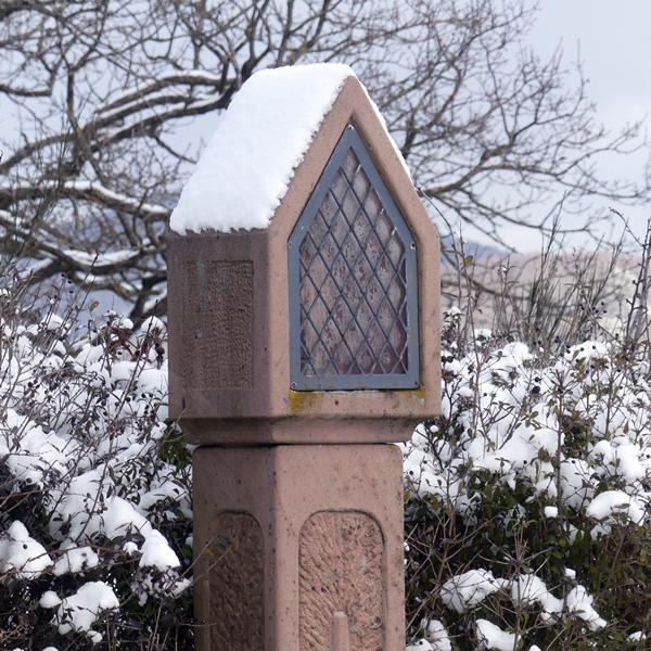 This wayside shrine is standing on top of hill and it had snow on top. Nowadays no new shrines are erected in Germany but they are a reminder of a more outwardly religious past.