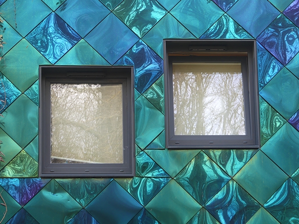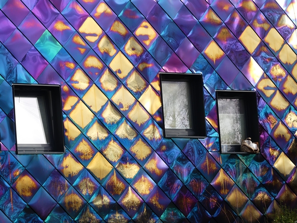 This is where the Frankfurter Verein is housed, a society that offers housing for disadvantaged people. With a facade like, this fancy windows would be too much. Hence the windows are very simple and straightforward – yet not in a straight line. The whole house, or rather the two buildings, are covered in an iridescent sheeting which changes colour depending on the light and one’s position.
