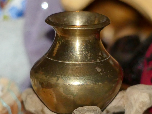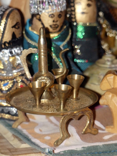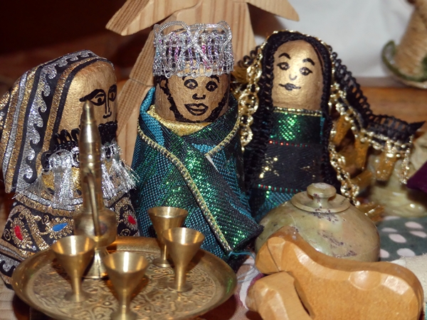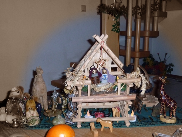 This is our Christmas manger, made from odds and ends. It started out with salt dough figurines which I dressed in meaningful scraps, like a piece of leather from a jacket an aunt gave me, an embossed hair ornament I bought when I was 15 in the South of France, a handkerchief which was a present from a friend, and so on but then there were things added which I found in the souqs of Saudi Arabia. Then the children added animals they found and decorated with shiny bits and pieces.