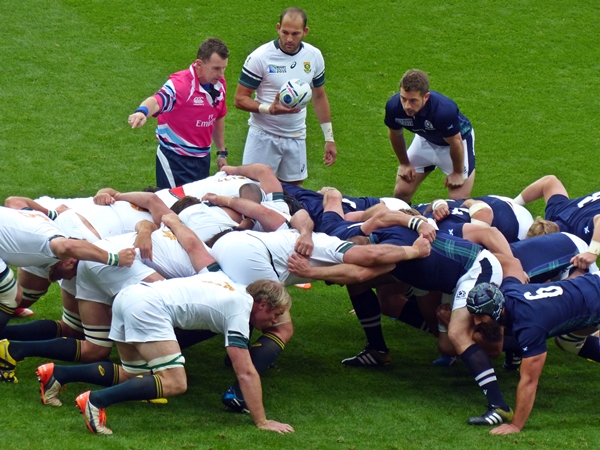 The man in pink is Nigel Owens, well-known Welsh rugby union referee, telling the scrum what to do. This was the game Scotland v. South Africa in Newcastle in pool B of the Rugby Wold Cup 2015.