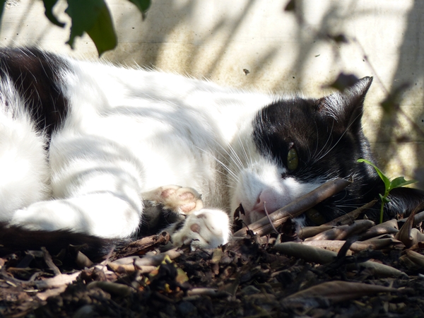 Johnny is the neighbour’s cat. He and our cat Henry are not on good terms, in four years they’ve learned to tolerate each other. But Johnny keeps sneaking in our house and eating Henry’s dry food. Because he is not supposed to (he is on a special diet) we shoo him away when we comes by. Hence Johnny is wary of us and usually leaves when he sees us. Not so at the moment. He lies under the shrubs in the garden and the most he does is open one eye when we come close to him.