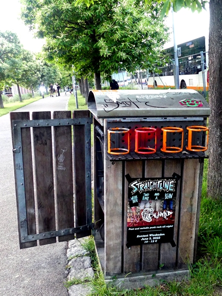 Plastic bottles carry a 25 cent deposit in Germany hence there are many people rummaging through refuse bins to fish them out. With hard times this has become a way to supplement income for many. To make it less dirty and possibly demeaning a new type of rubbish bin has appeared in some towns: instead of throwing the bottle in the bin, one can stack it in one of the holders on the side.