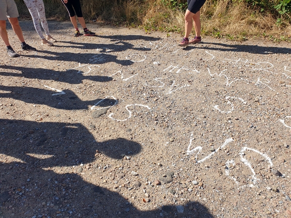 Once a week we indulge ourselves by participating in a paper chase. One of us prepares a trail, marks it with chalk and then he has to explain his/her signs in detail to the rest of the group. Some signs are pretty standard, others are more creative. Either way, the audience is captivated.