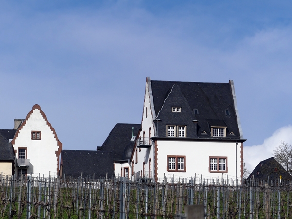 This is the Domdechaney or the Domherrenhof (deanery) in Hochheim am Main. It’s part of a charming old town in the middle of the wine growing district of the Rheingau. It has a historic centre that’s worth visiting. Queen Victoria did in 1845, she called the wine she drank here “hock” and that became a synonym for Rhine wine in the UK ever since.