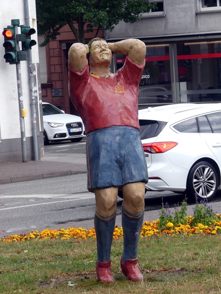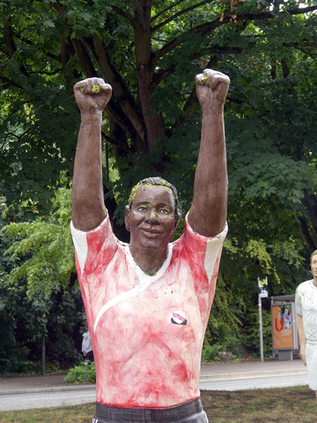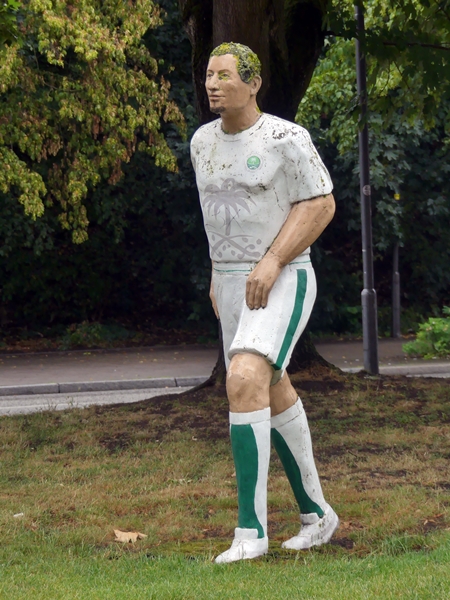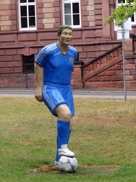 Five matches were played in Kaiserslautern (my husband’s hometown) when Germany hosted the World Cup in 2006. In a square near the train station there are ten statues of players from all the teams that played in K’town (that’s what the US soldiers stationed nearby call it). They are slightly larger than life and I think made of papier mâché judging by the yellow-green moss growing on them.