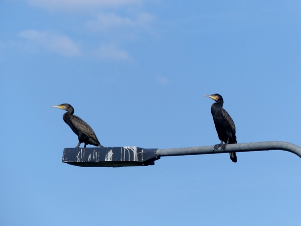 If there are frogs and fish and things, cormorants are not far behind. But they like to be high up where they have a vantage point, e.g, on a street lamp – even if is a rather shitty one.