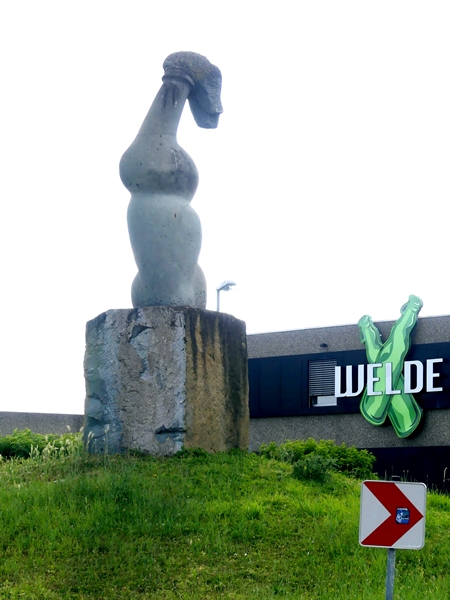 It stands in the middle of a roundabout near a local brewery called Welde. The brewery has very unique bottles that look twisted on top as you can see on the logo in the back. The concrete bottle on the rough pedestal is twisted even more and it looks as if it is melting with the beer foaming on top. Overall really odd and not necessarily tempting to try the beer (which, btw, is a real good brew).