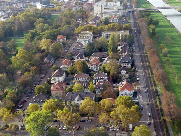 Mannheim from above, the tv tower in fact. The houses of the Oststadt were mainly built in the early 20th century and are rather grand, hemmed in by wide roads. The road on the left (or North) is running parallel to the river Neckar.