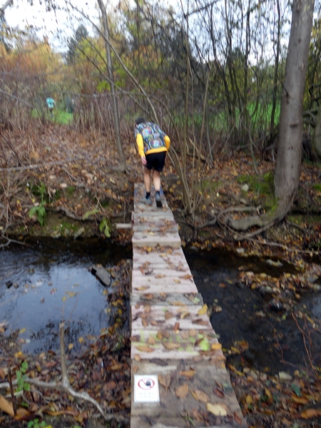 We were out on a run, or possibly walk, when we came across this fragile footbridge with an unmistakable sign: Keep off! Being the way we are, the outcome was inevitable: