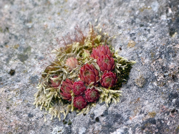 When I think of succulents my mind turns towards exotic plants like cacti and particularly the succulents found in the South African Karoo (apparently one third of all succulents species). But – the common house leek found on any old roof around here and on walls and the like is a succulent, too.