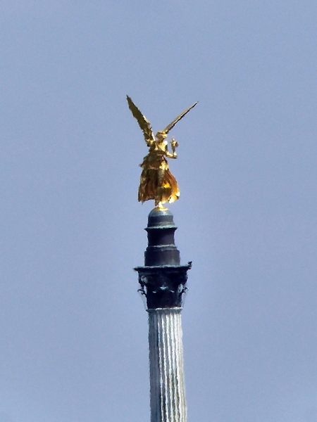 This is the Friedensengel (peace angel) in Munich. Built about 20 years after the Franco-Prussian war the angel is an imitation of the Greek victory goddess Nike of Paionios (a Greek sculptor who lived in the 5th century BC), a synonym for a victory achieved with military means.