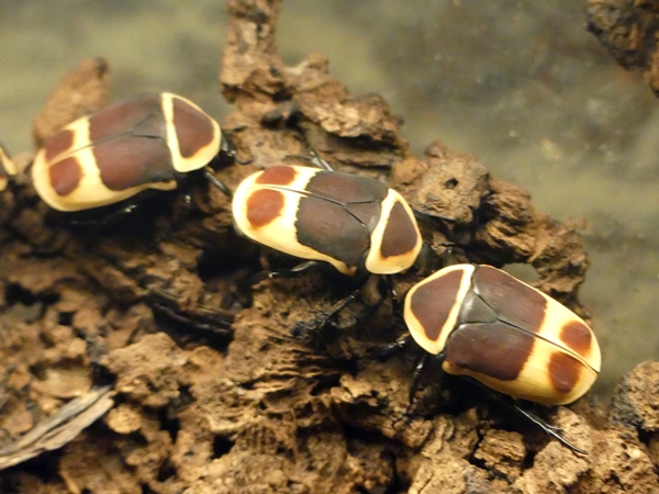 Three Congo chafer beetles. They looked so pretty in their enclosure. Checking up on their English name I learned that they are often kept as food for terrarium animals. (Yes, I know that the iguanas and lizards and monitors need food, too, but putting the food on display beforehand … I feel hoodwinked, somehow – or possibly even bamboozled.