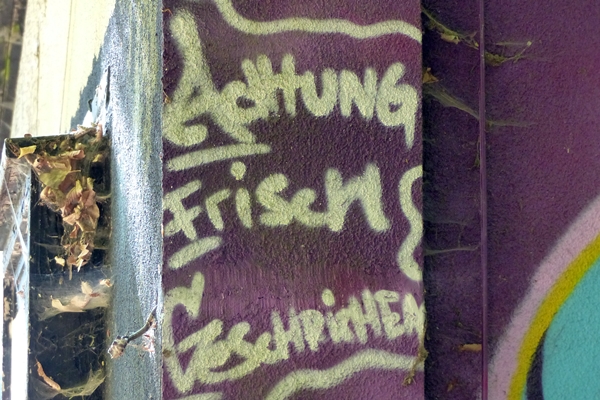 Graffiti is more fleeting. The words “frisch gestrichen” are misspellt, again probably deliberately. The unsophisticated way that whole wall looks like though, it might be a genuine – lasting – mistake.