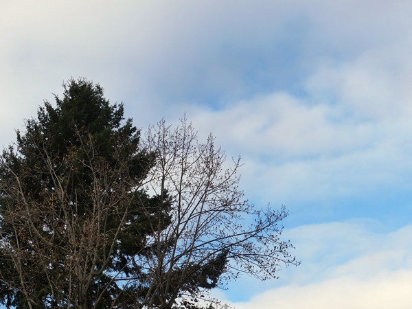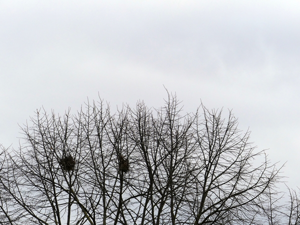 I’ve been sick the past few days, i.e. my camera and I stayed at home. No sky pictures or anything. But since Hammad has revived his challenge Weekend Sky I just had to slip out and click a couple of grey clouds. The trees are still pre-spring with the old nests from last summer showing clearly.
