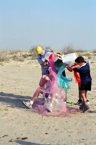 I’ve told people about the Hash House Harriers before. This is a gunging, usually administered to somebody who is leaving the Magic Kingdom (aka Saudi Arabia) on a no-return exit visa. Hashers get Hash names after a while of running with the group. Children get Hash names, too. The little guy in blue is called The Interrupter.