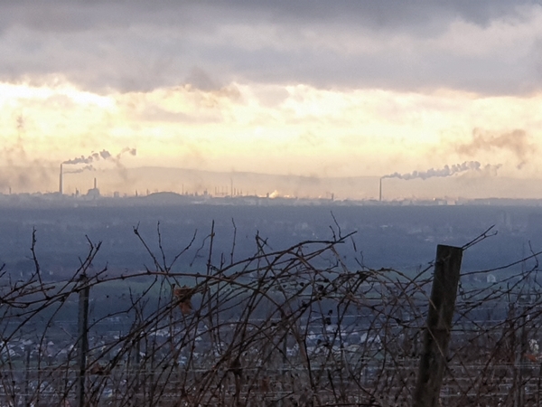 The industrial part of the Upper Rhine Valley, the area around Mannheim and Ludwigshafen in the background, and bare vines in the front.
