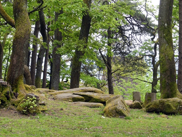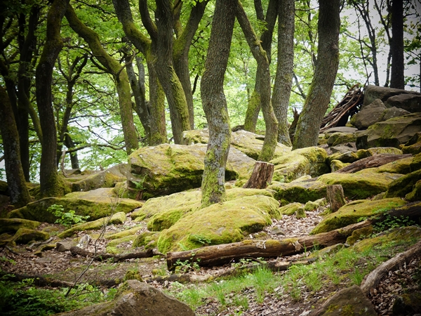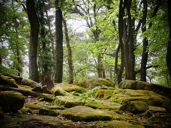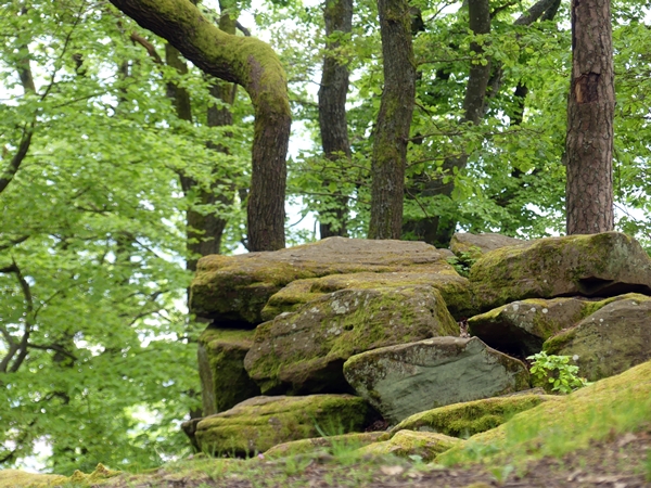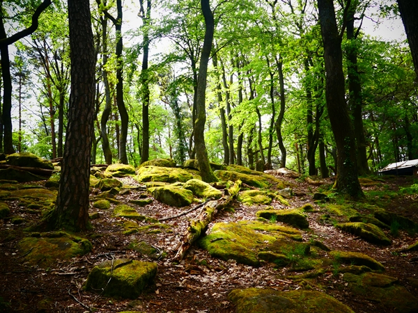 Rietberg is a hilltop in the front row of the Palatinate Forest and thus overlooking the Upper Rhine Valley. One can ride an old rickety chair lift or walk up to the Rietburg, a fortress built in the 13th century. The actual top behind the castle is covered by an old wood, trees interspersed with large moss covered boulders. If it weren’t for the frequent hikers walking about it would feel like an enchanted part of a fairy world.