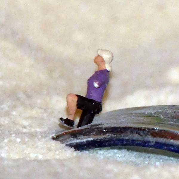 I noticed that one of my minikins had met with an accident. The height of a minikin is about half an inch. I did find the severed limb but surgery was delicate. I don’t think I did a great job but … I tried.