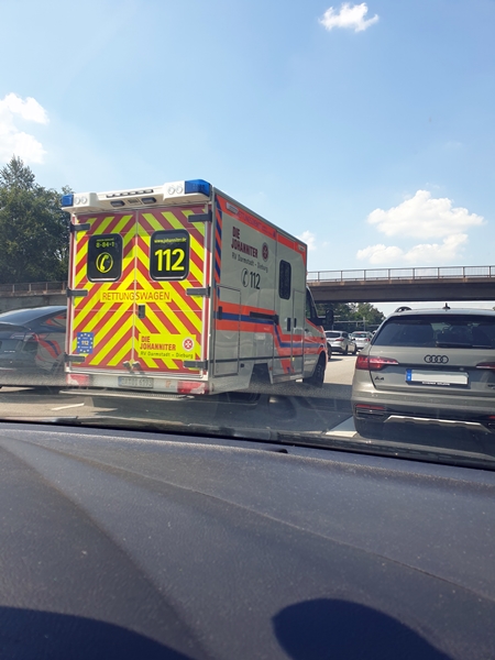 Yesterday we were driving on the A5 towards Frankfurt when the cars in front of us slowed down and came to a stop. Luckily no brakes screeching – everybody was paying attention and just rolled to a stop. Pretty soon we heard an ambulance siren approaching and the cars split to clear a lane for emergency vehicle access. It was a beautiful “Rettungsgasse” if not a 100% correct one. It’s supposed to be further to the left but it worked: a wide lane was opened for five ambulances, three large fire engines, a few smaller ones and a number of police cars.