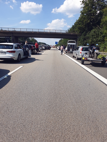 We could see no wreckage when we were finally allowed to pass. I’ve since checked the local radio stations incident report and the accompanying photo was horrific. A Renault from France with three passengers crashed without the involvement of another vehicle, reasons so far unknown. Two of the passenger had to be cut out of the wreck and needed to be resuscitated. One was airlifted to a hospital in Frankfurt, the other two were transported to the nearest hospital. I wish them all well and a good recovery.