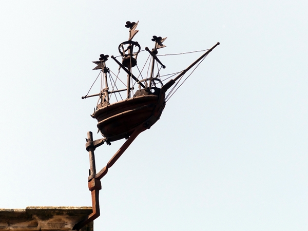 Three masts, three flags on the threemaster displayed at the corner of the “Loge de Mer” in Perpignan, a the gothic-Catalan building that housed the administration of the region in the middle ages.