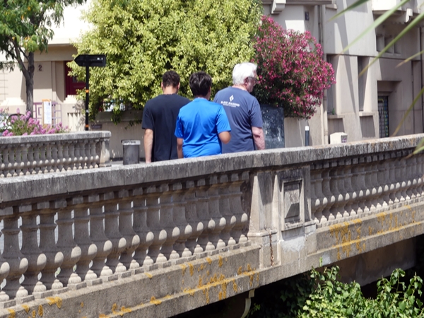 Three tourists rossing the canal of the Bassa (the river is called Têt but the part flowing through central Perpignan is called canal de Basse in French, Bassa in Catalan).