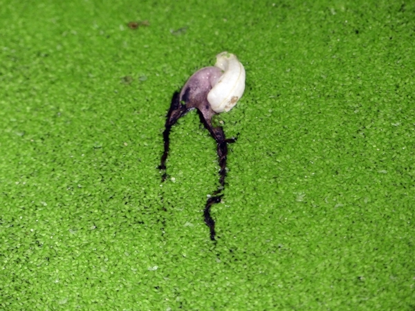 A dropped tropical flower in a pond covered in duckweed.