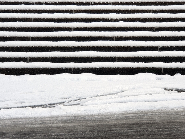 Stairs and their horizontal stripes accentuated by snow.
