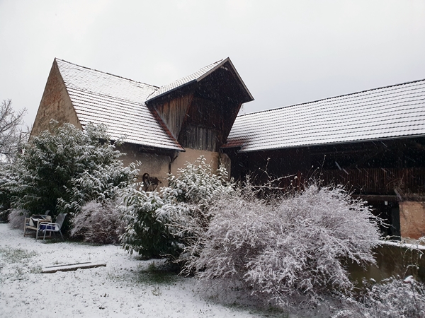We live in a new apartment building with seven units. Our neighbour next door is an old farm, with the barn, the yard, and the house. When we moved in ten years ago, the farm was already not a working farm anymore. The old farmer lived in the front building, two ponies were stabled in the barn for the grandchildren living in a house on the other side of the gardens.