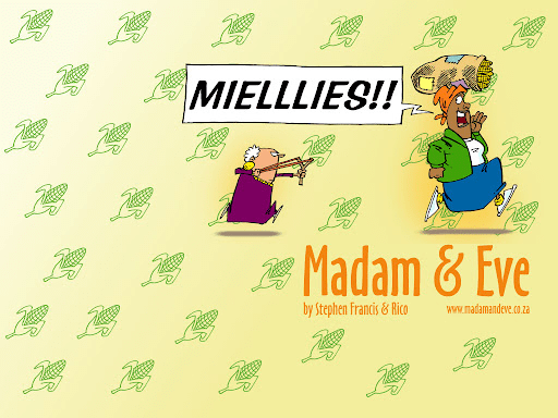The love-hate relationship between an English granny, who came from overseas to live with her daughter, and the mielie seller is a sub-story within the cartoon about – surprise – a white madam and her black maid, aka Eve. There is more than a kernel of truth in those cartoons about life in South Africa. Also, I think Mother Anderson uses mielie kernels as her ammunition.