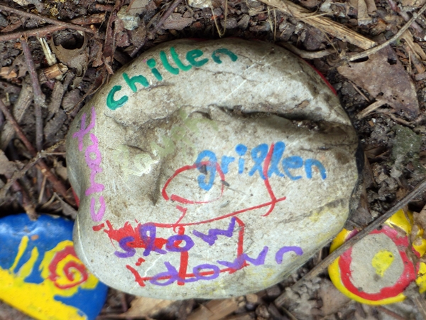 (This is a pebble from a pebble line during the first COVID lockdown. They also added “chat” which might not be good advice now but maybe was then. Also the curious mix of English and German doesn’t do anything to make me mellow – but maybe that’s just me.)