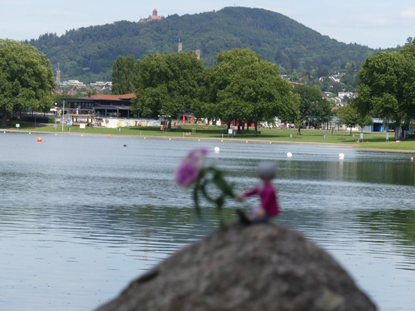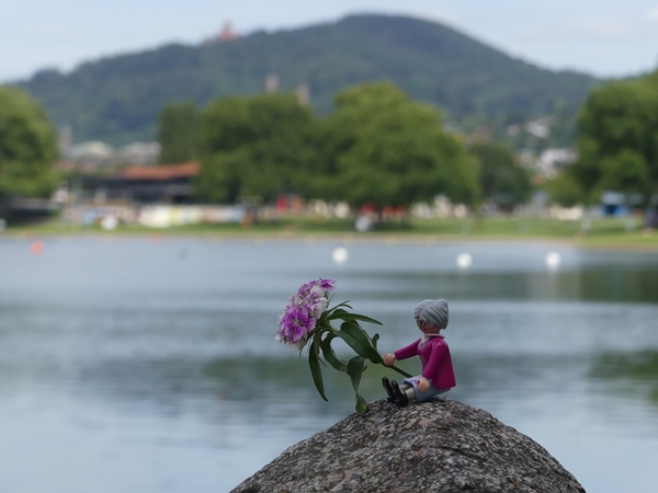 Whenever I search my archive for the tag “water” my toy photography pics come up first (due to the way I’ve organised my files). And since no new water pictures have come in I thought I feature a sunny photo of my little grandma in front of the local lake with the two castles in the background.