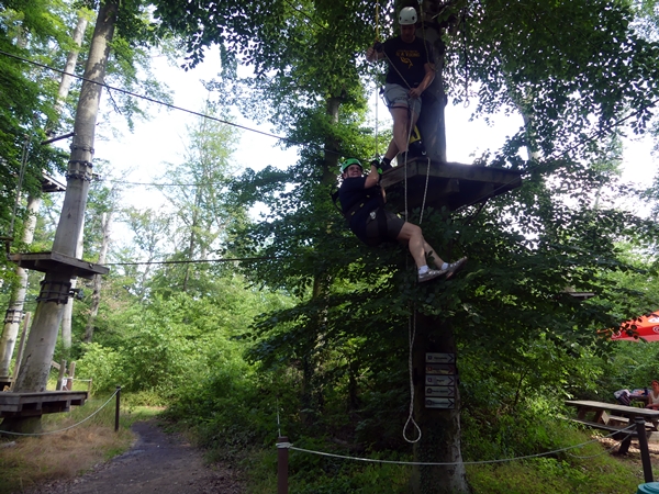But it was. In the left photo I’m getting rescued – I was abseiled because there is no getting back because of the way the parcours is set up. — At least, I tried.