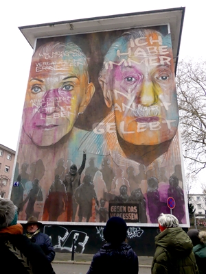Luigi Toscano’s mural in Mannheim is called “Gegen das Vergessen” (against forgetting, or maybe more poignant: Lest we forget). The two portraits are of two Holocaust survivors. The quote from the woman reads: “We need to remember the past but we must not live in it.” The man’s quote reads: “I’ve always lived in fear.”