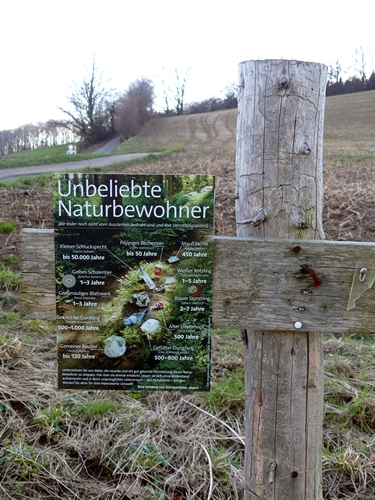 The poster not only shows the unpopular residents and names them (they sound akin to birds and mushrooms) it also details their staying power, e.g. yellow shellthing 1-3 years (aka: slippolus bananicus or a banana skin), warbling swallow up to 50,000 years (aka: liquor cadaveri or glassy shot bottle), or cupped paper muggy up to 5 years (aka: cofficus warmicus or paper coffee mug).