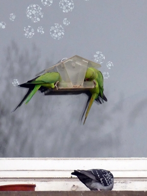 A trio – two ring-necked paraketts and a pigeon – showing me their backside.