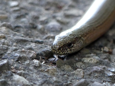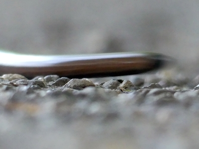 When I showed the little slow worm for Wordless Wednesday I didn’t think I would post other photos of our encounter in a hurry. Along comes Fan’s FOWC prompt and here it is again, gravel and all.
