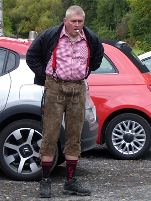 This is a Lederhose, made of leather and with the characteristic codpiece and decorative stitching. If it’s a proper Lederhose it will outlast the wearer. In 1911 Börries von Münchhausen, a descendent of Baron von Münchhausen on whom the literary figure of the lying, adventurous Baron was based, wrote a satirical poem about such a Lederhose and I’m glad to report that today that is the only one of his writings that has survived in the general public. In his others writings he revealed himself to be a rassist, a anti-semit, and a national socialist.