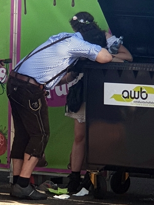 However strong and lasting a Lederhose is – it will not protect the wearer from the hazards of life. The wearer below had indulged to much at the local fest. Nice Hose, though.