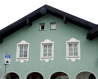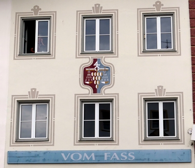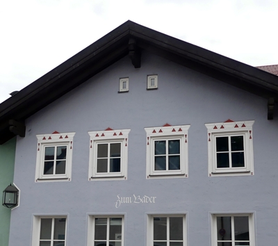 I wrote last week that Bavarian window seem to be all about shutters but that seems not to hold true for downtown Bad Tölz. I saw a lot of painted window frames. The blueish grey house has the inscription Bader, i.e. barber-surgeon; the cream coloured house is a shop where they sell various liquids on tap – wine, vinegar, oil, liqueur, spirits. The liquid that’s normally associated with “from the vat” (i.e. beer) is not sold.
