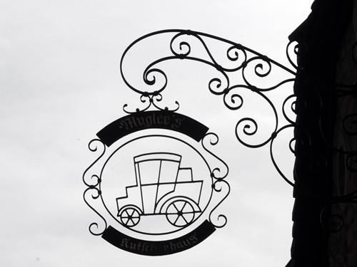 The very first cars looked very much the same. I can only be sure when I really lighten the photo so that I can read the name on the sign: Kutcherhaus, aka coach house.