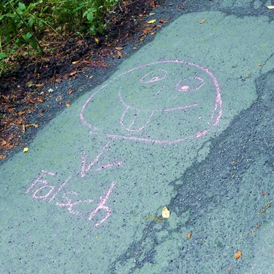 And then I came across this red chalk by German youngsters (aspiring hashers?): Tongue out and "ätsch", aka: nya-nya! Go back!