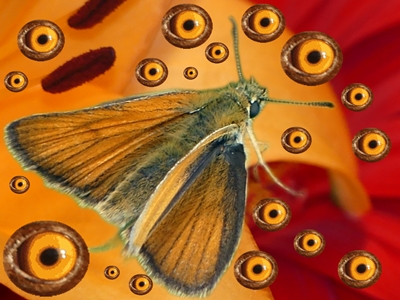 In case somebody is wondering: the butterfly is called a little skipper in English (braunkolbiger Braun-Dickkopffalter in German, a real mouthful: Brown-spadixed brown thick head butterfly); the eye is from an Egyptian goose; the background is an orange daylily. In order to isolate the butterfly and the eye I used lunapic.com, a web based photo editing site.
