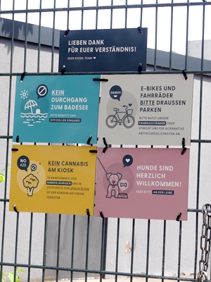 This is a leftover from yesterday’s post. The tone of all those notices is very cordial. They hang on the entrance to a kiosk area which can be accessed from the lake, a gated swimming area, or just from the street if you don’t want to swim but just buy a snack or a drink.