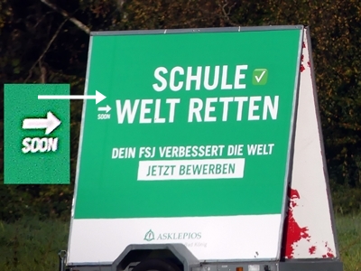 And then there is Denglish (the German equivalent of Franglais). Or throwing in an English term in a German sentence, usually to garner acceptance with young people. The example below is minor but still stupid. It’s an add for the Voluntary Social Year in Germany, mainly directed at young adults, financed by the German government. It reads: “SCHOOL /check/ -> soon SAVE THE WORLD”. Besides the unnecessary English it’s also the wrong word: “next” would have been better.